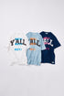 ロゴ(Y’ALL)Tシャツの上からラバー素材で作った異なるロゴ(HEY!×3)を圧着したアイテム