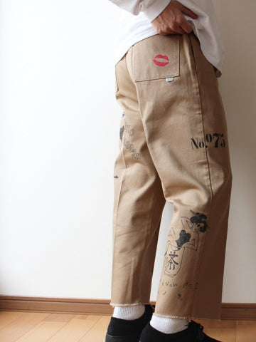 ウエスト部分はゴム仕様で、裾はカットオフにし、ゆったりとしたシルエットに仕上げている