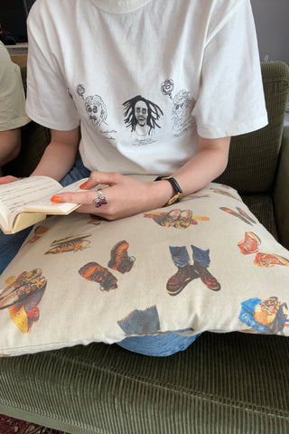 様々なシューズのイラストが施されたリサイクルコットンのファブリックを使用したクッションカバー。