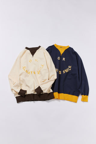 着古してフロッキーが掠れたような古着の雰囲気を再現し、ロゴはスマイルの顔になるよう配置
