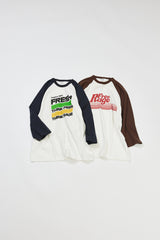 ネックから脇にかけて斜めに生地の切り替えが入るラグランTシャツ。